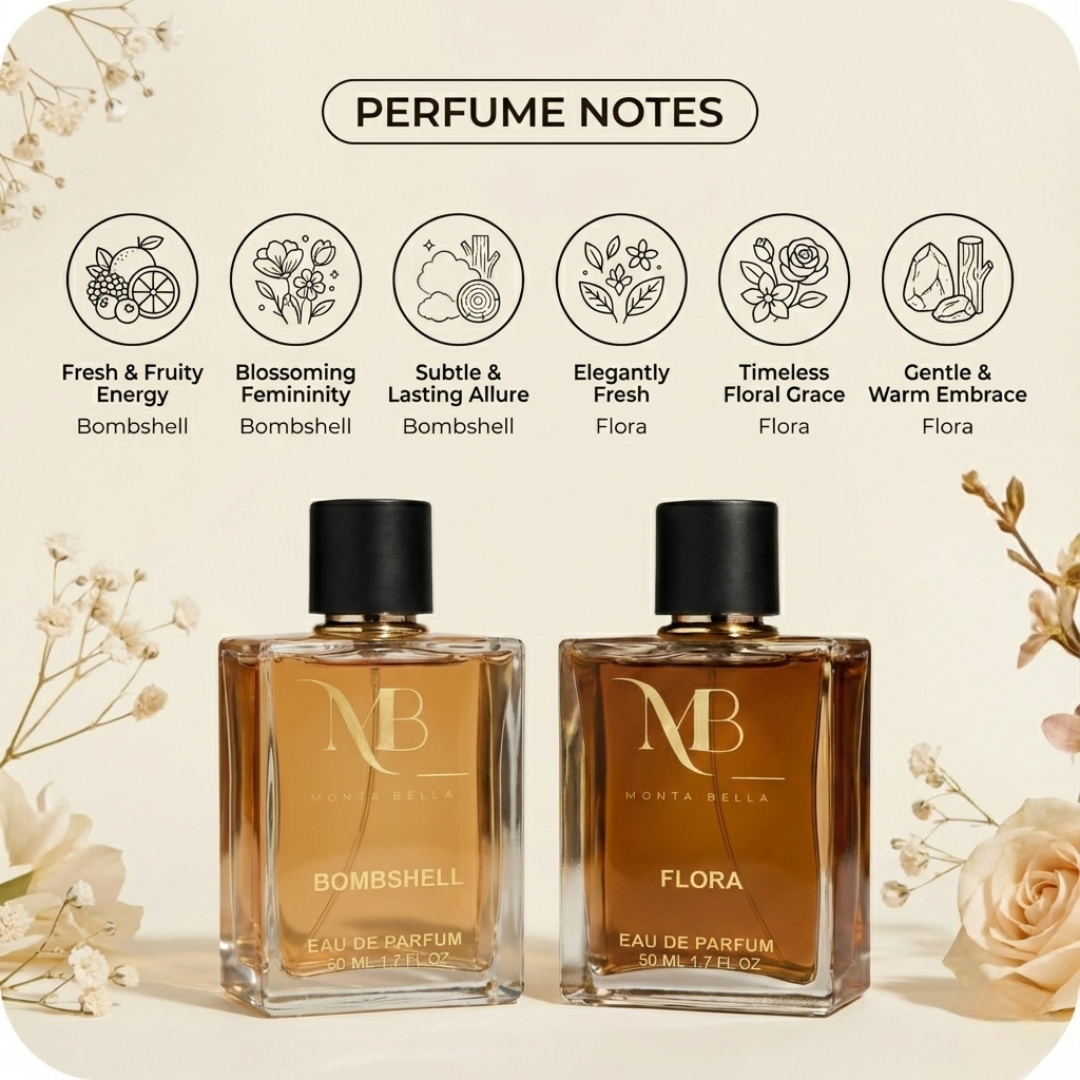 The Montabella Bombshell & Flora 50ml Perfume Combo for Women is a celebration of elegance, charm, and femininity. Designed for women who appreciate both freshness and grace, this duo perfectly balances youthful vibrance with sophisticated allure.