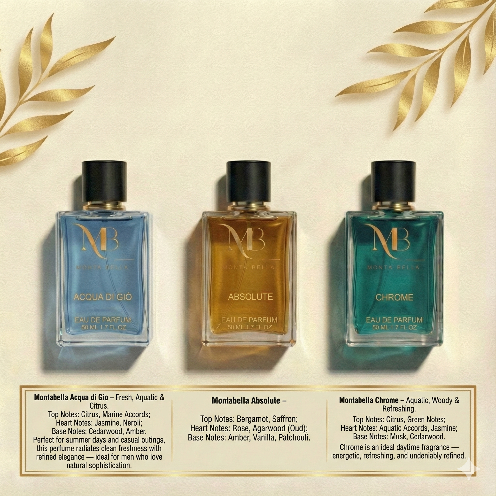 Discover the power of contrast with this Montabella Premium Combo of 5 Perfumes, a carefully curated fragrance set designed for those who appreciate depth, balance, and long-lasting impressions. This combo brings together fresh citrus, aquatic clarity, woody calm, oriental richness, and deep amber warmth, making it a versatile choice for daily wear, evenings, and special occasions.