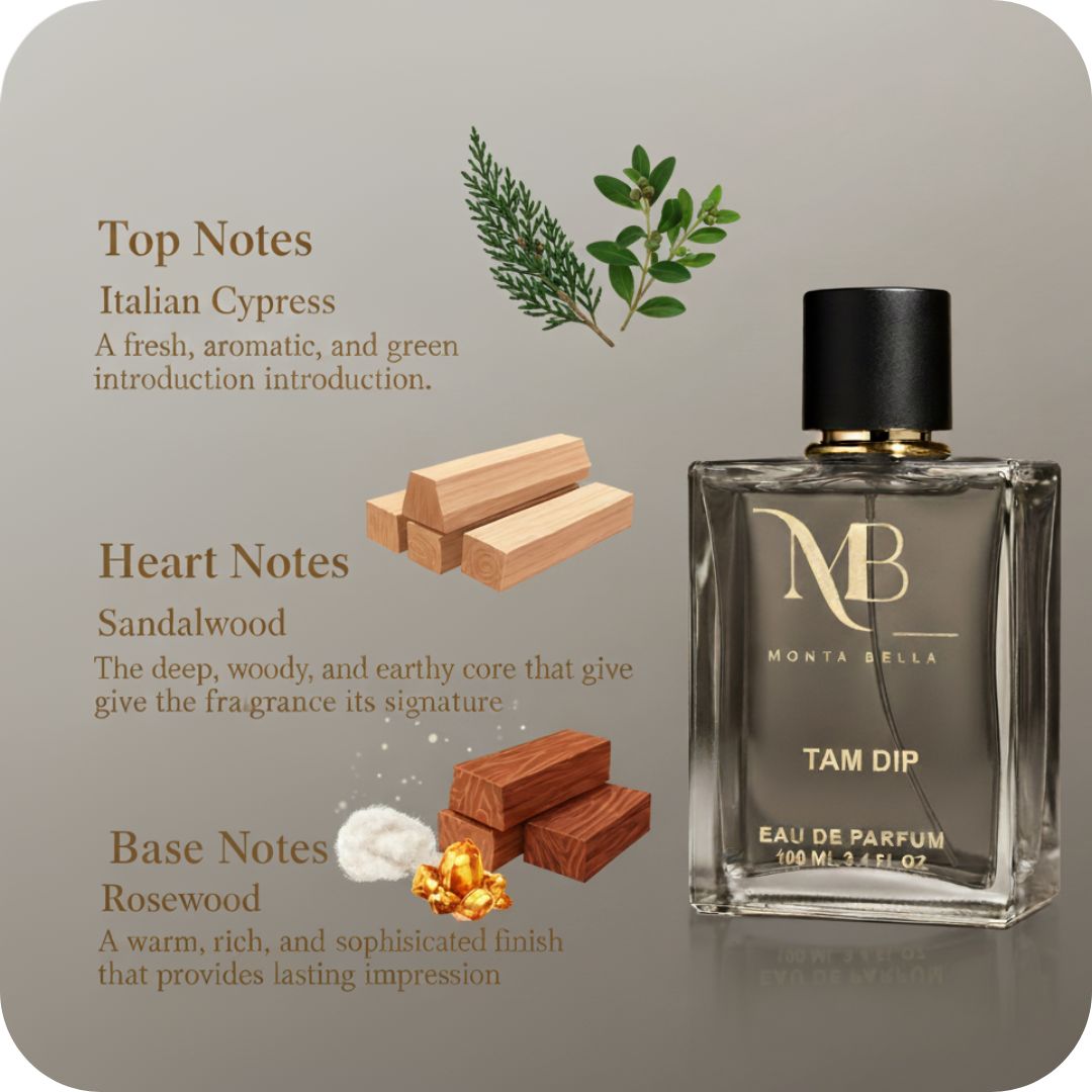 Encased in a bold, masculine bottle, TAM DIP reflects its powerful fragrance—dark, timeless, and prestigious. This sandalwood woody scent is a hallmark of Montabella’s perfume store, designed to elevate your grooming ritual with unmatched sophistication.